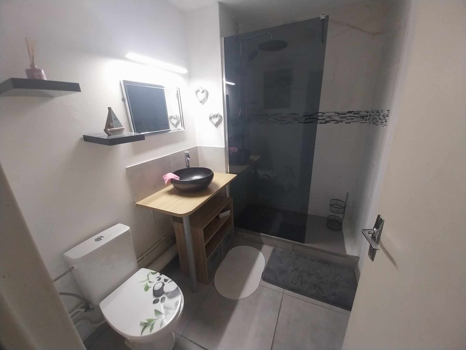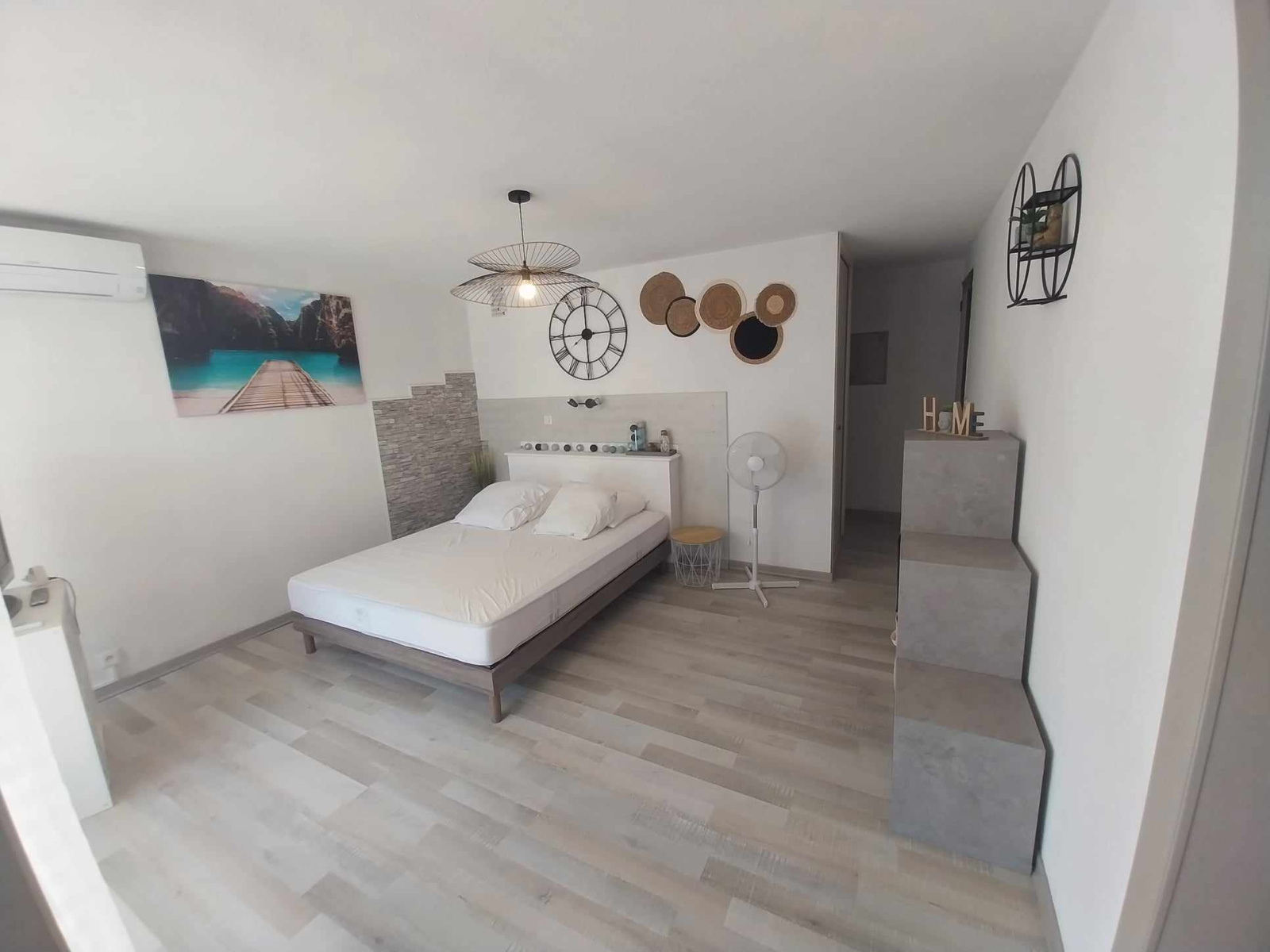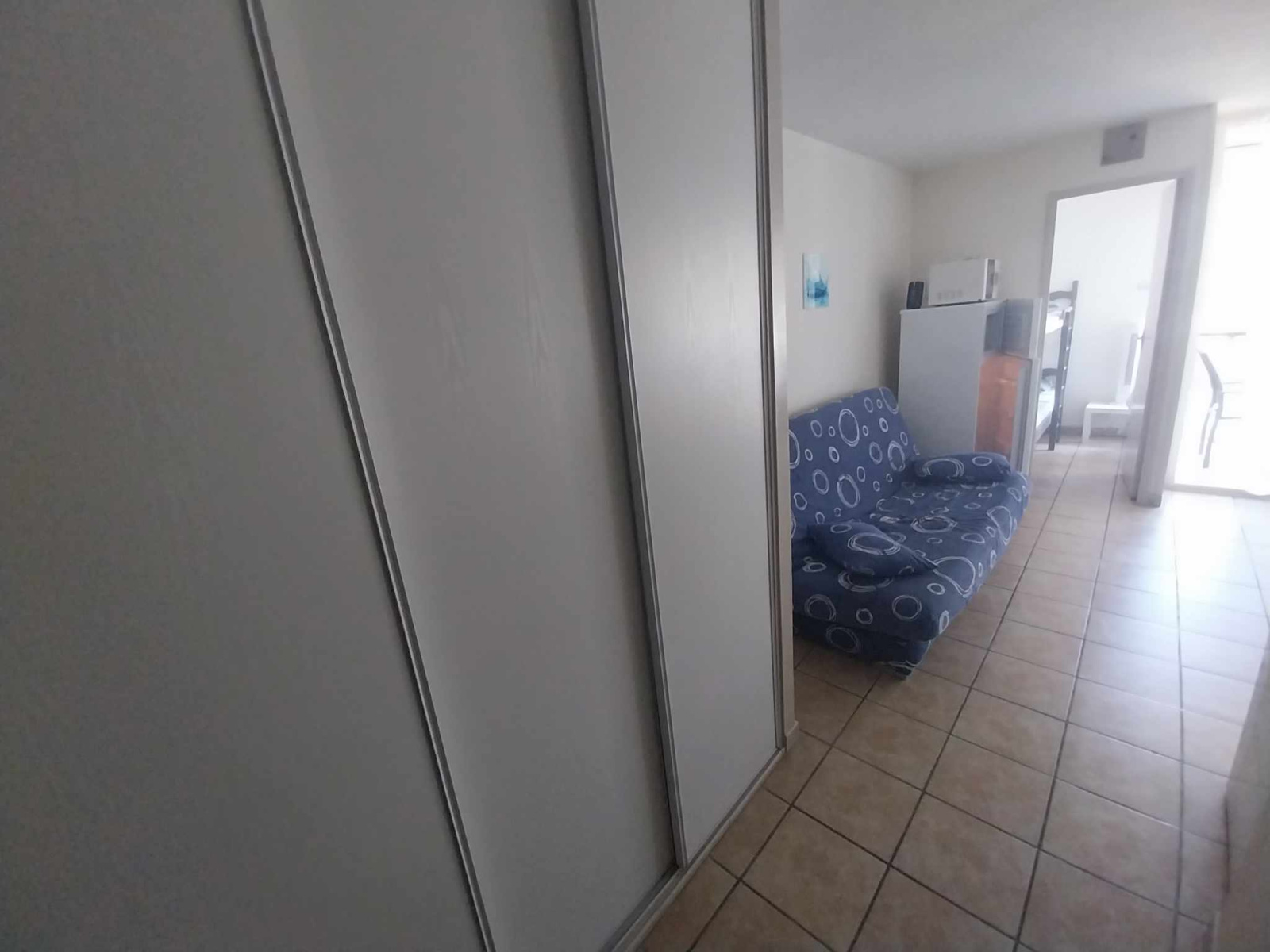 Vous diposez dans l 'entrée d'un grand placard de rangement, d'une salle de bain , de la piéce de vie avec cuisine ouverte, d'une cabine,