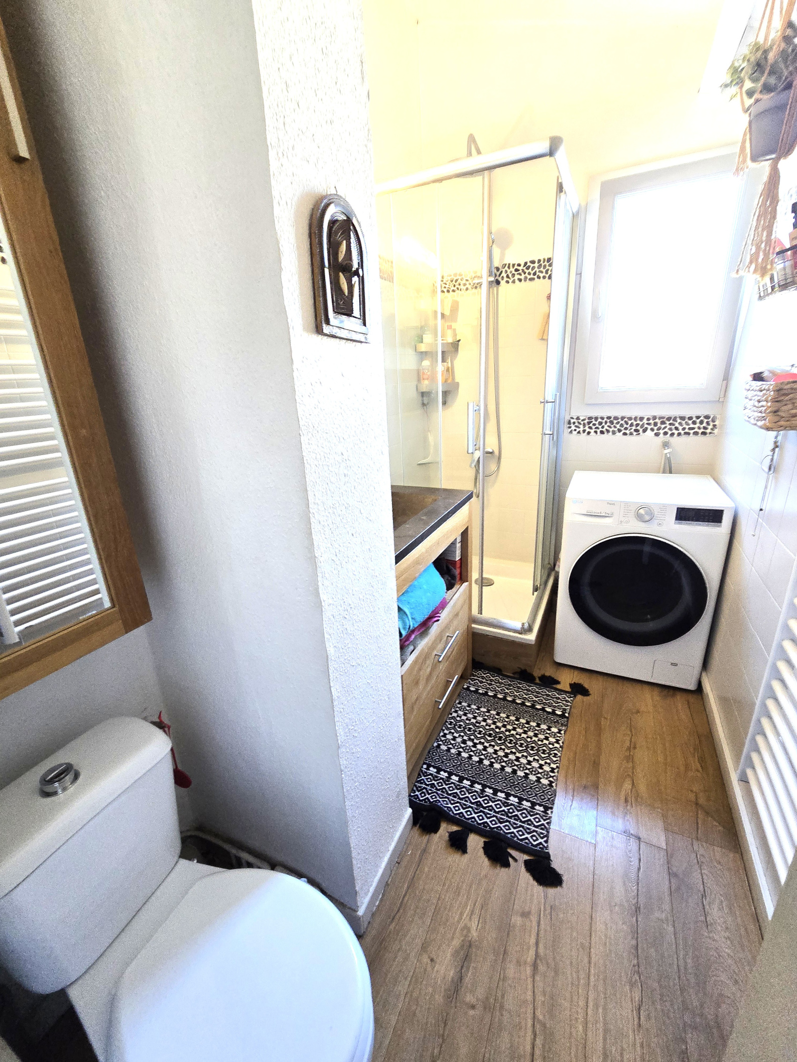 A l'étage 2 chambres et une salle d'eau avec wc. Le pavillon est équipé du double vitrage et les chambres sont climatisées.